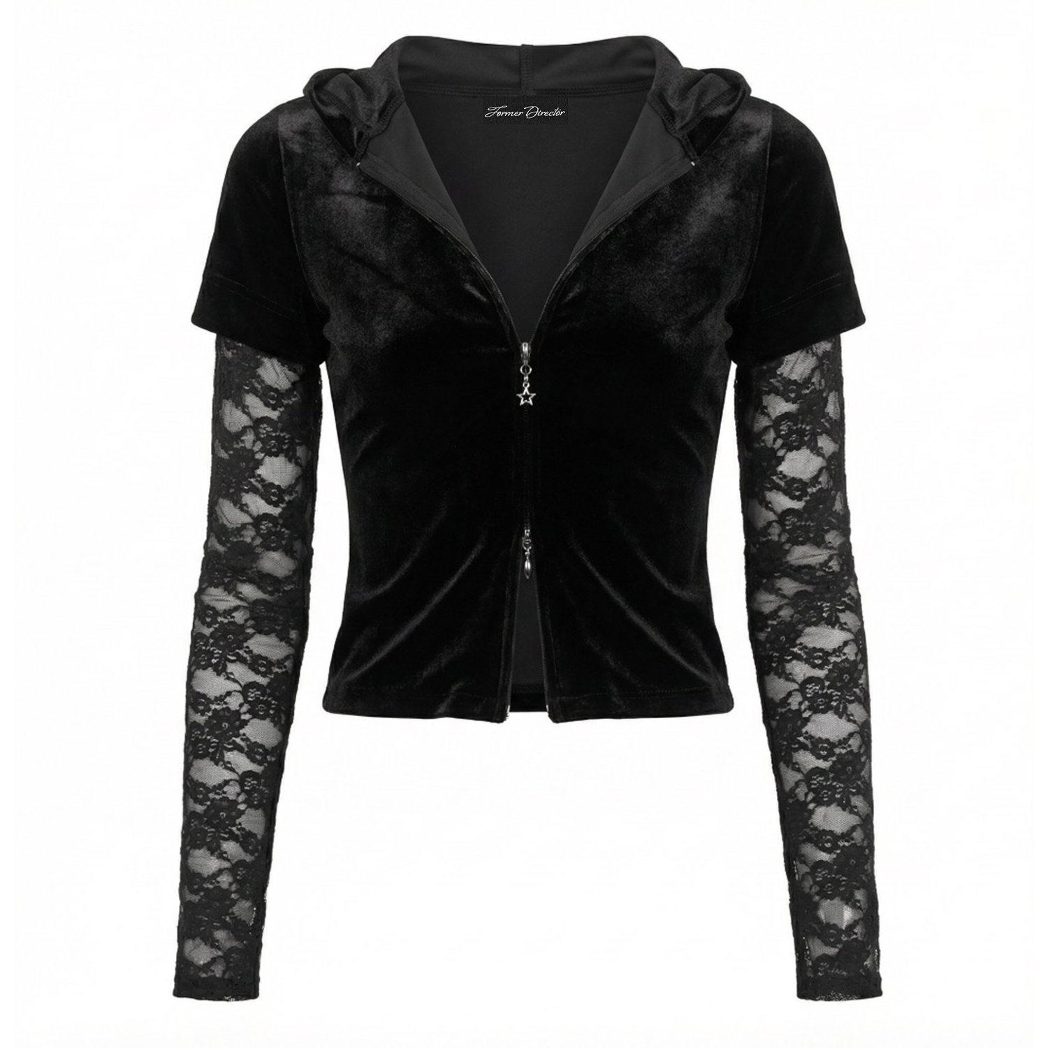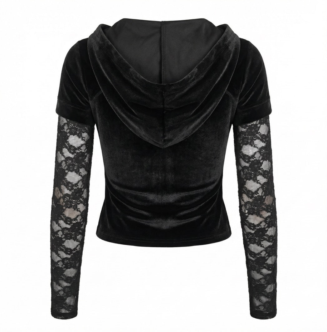 crafted in plush black velvet with sheer, stretch lace sleeves, it’s designed to blur the line between delicate and dangerous.